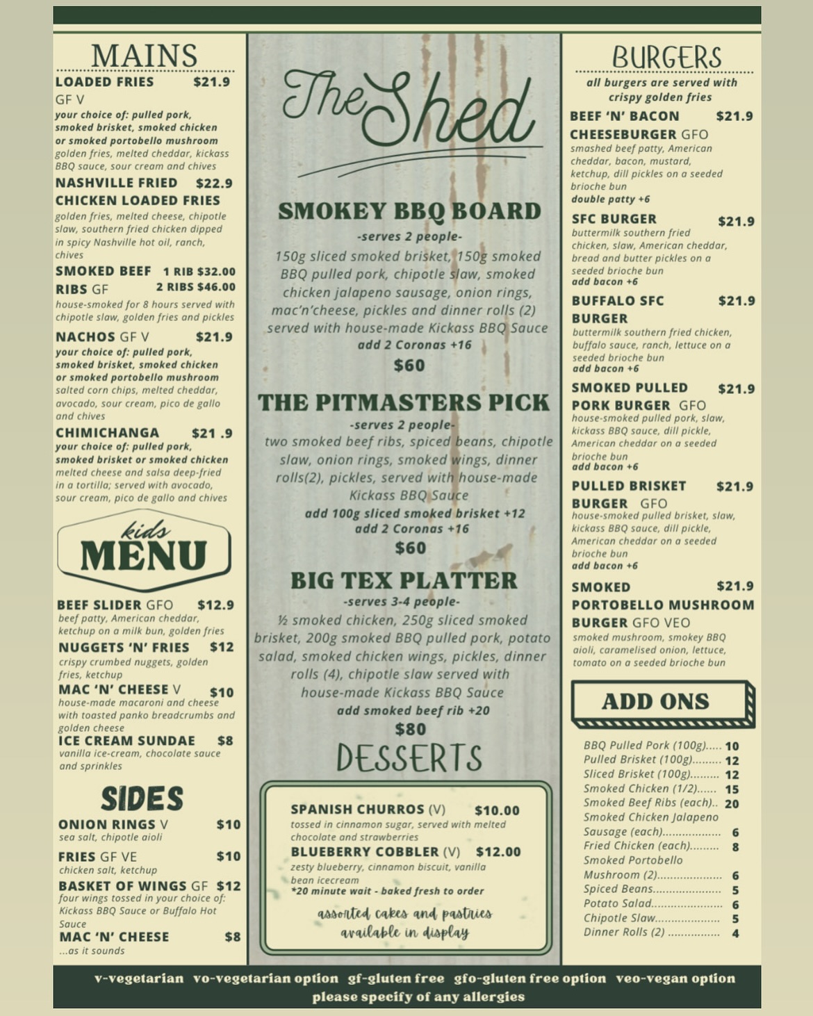 Your choice of; pulled pork, smoked brisket, smoked chicken, or smoked portobello mushroom. Golden fries, melted cheddar, kickass BBQ sauce, sour cream and chives.